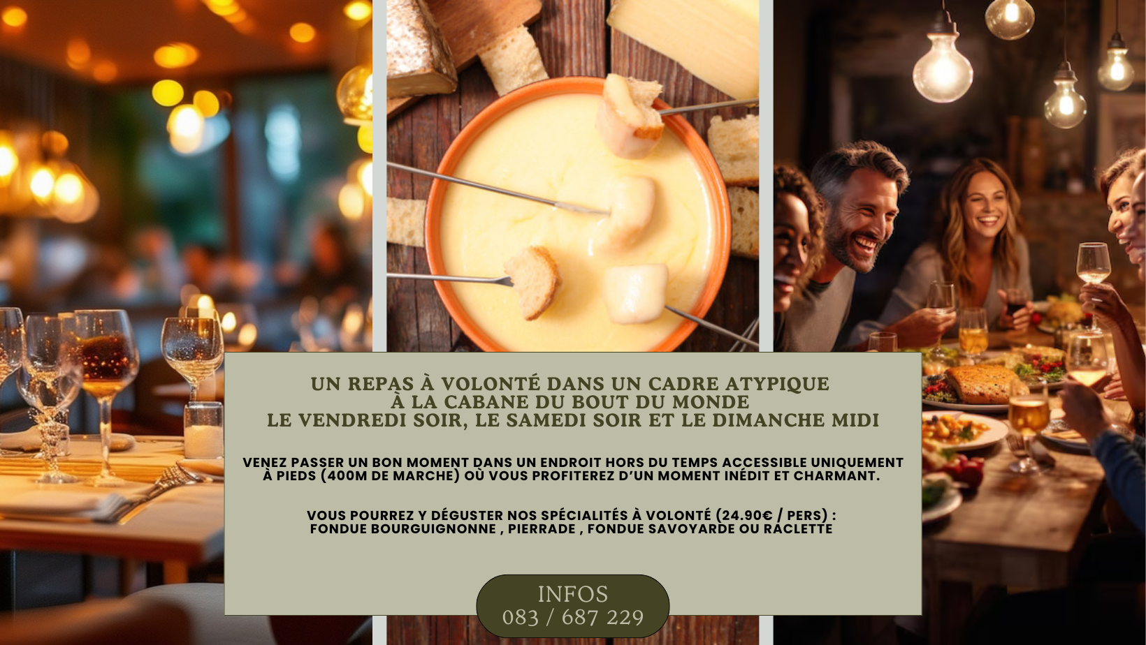Vous pourrez y déguster nos spécialités à volonté (24.90€ / pers) : Fondue bourguignonne, pierrade, fondue savoyarde ou raclette.
